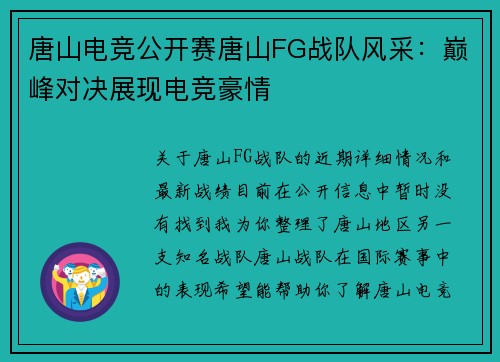 唐山电竞公开赛唐山FG战队风采:巅峰对决展现电竞豪情